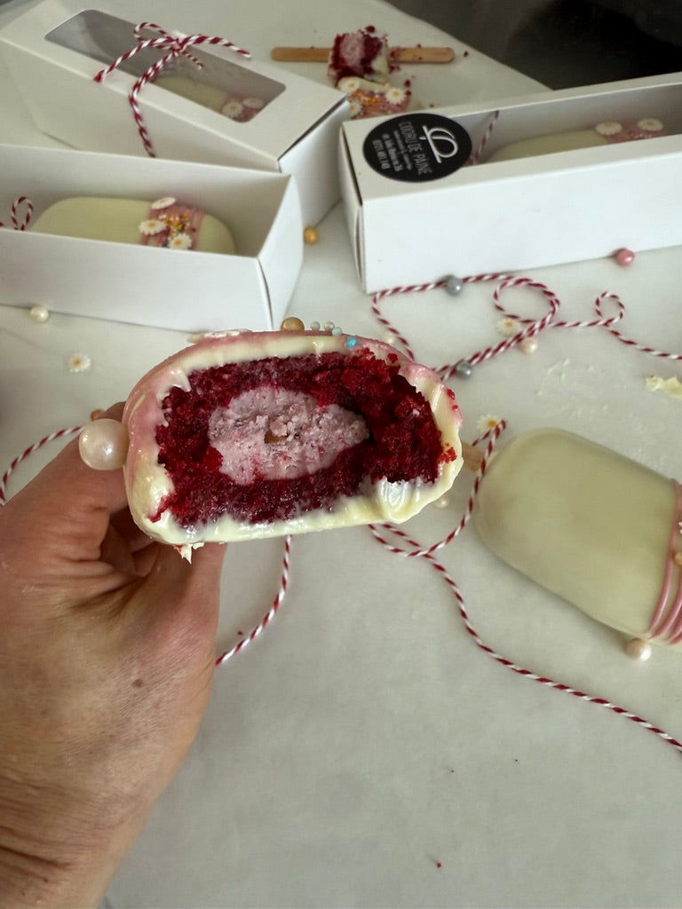 This cake pairs a soft, vibrant red velvet sponge with a smooth white chocolate ganache, lightly infused with the fruity brightness of freeze-dried raspberries.