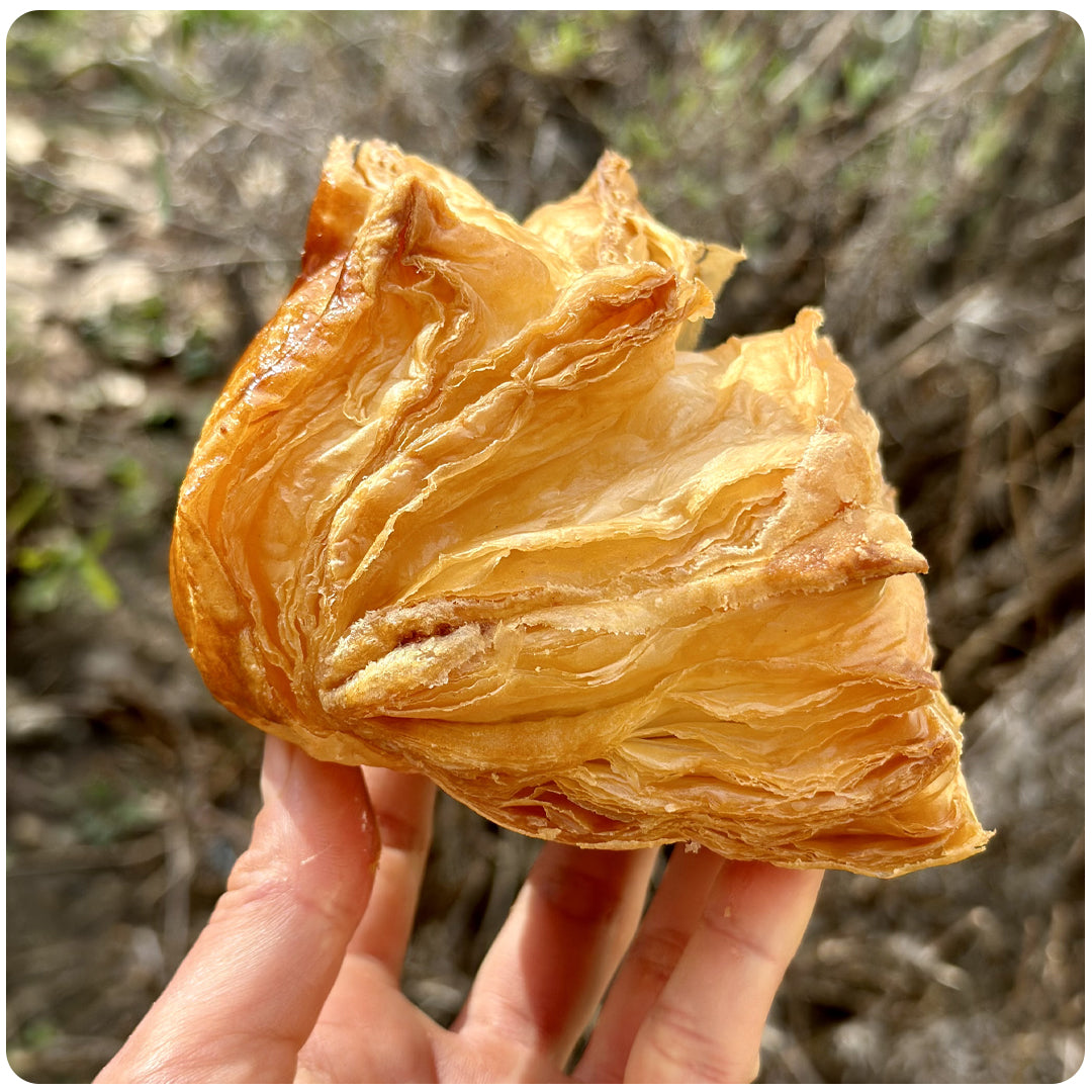 The dough is laminated with butter and, in the heat of the oven, it opens into thin flakes, layer over layer, well puffed and golden, hiding inside a soft, salty cheese filling.