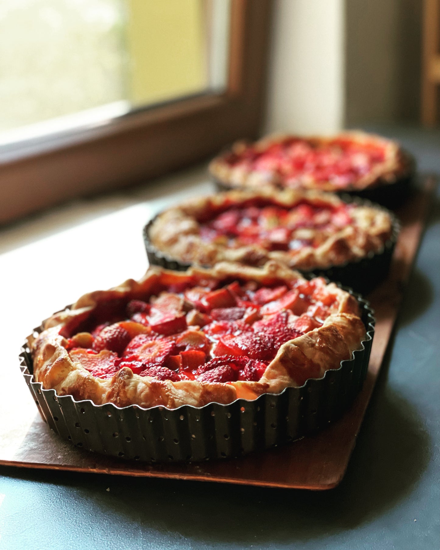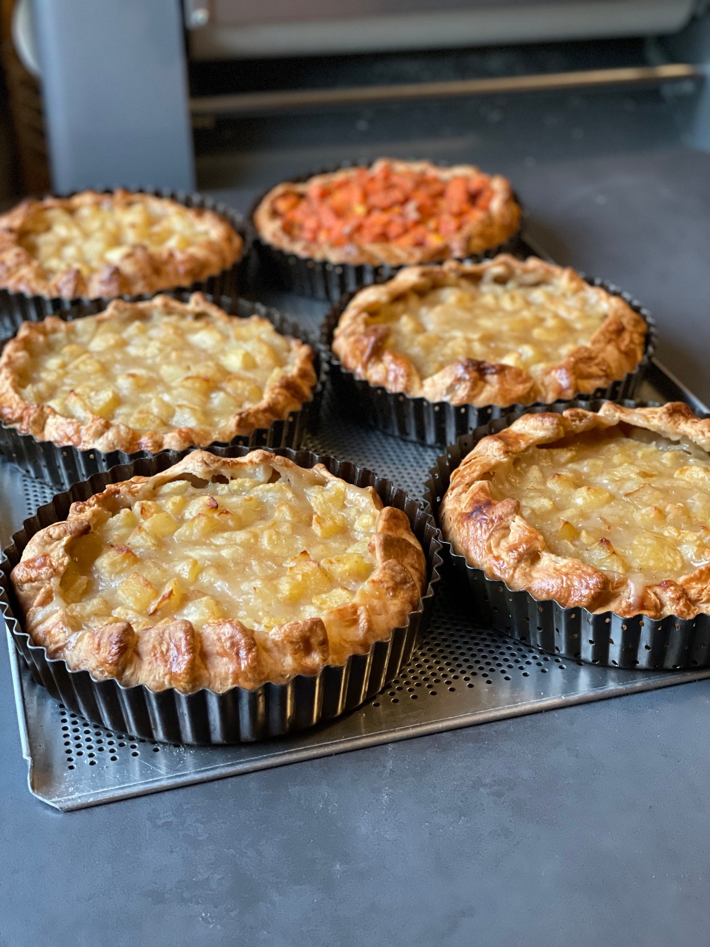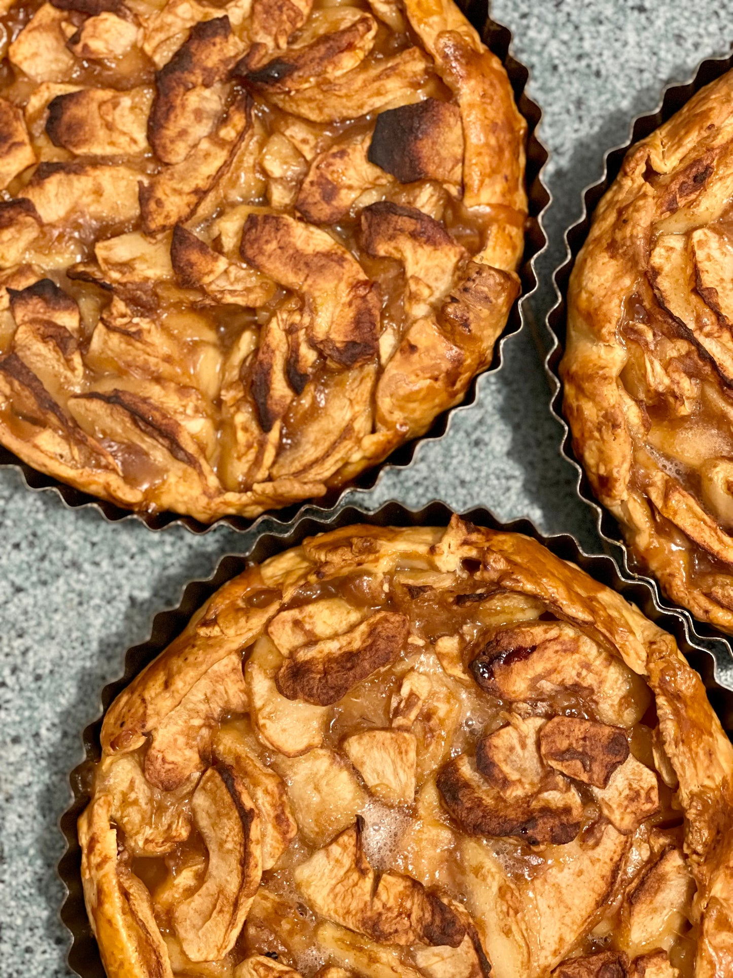 We add just a touch of brown sugar, starch, vanilla, and cinnamon, then bake them slowly until the crust turns golden and the fruit releases its sweetness and aroma into the crisp pastry.
