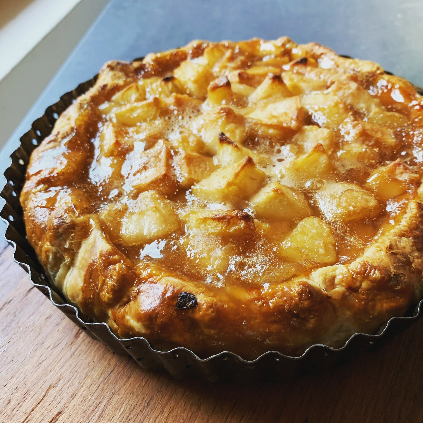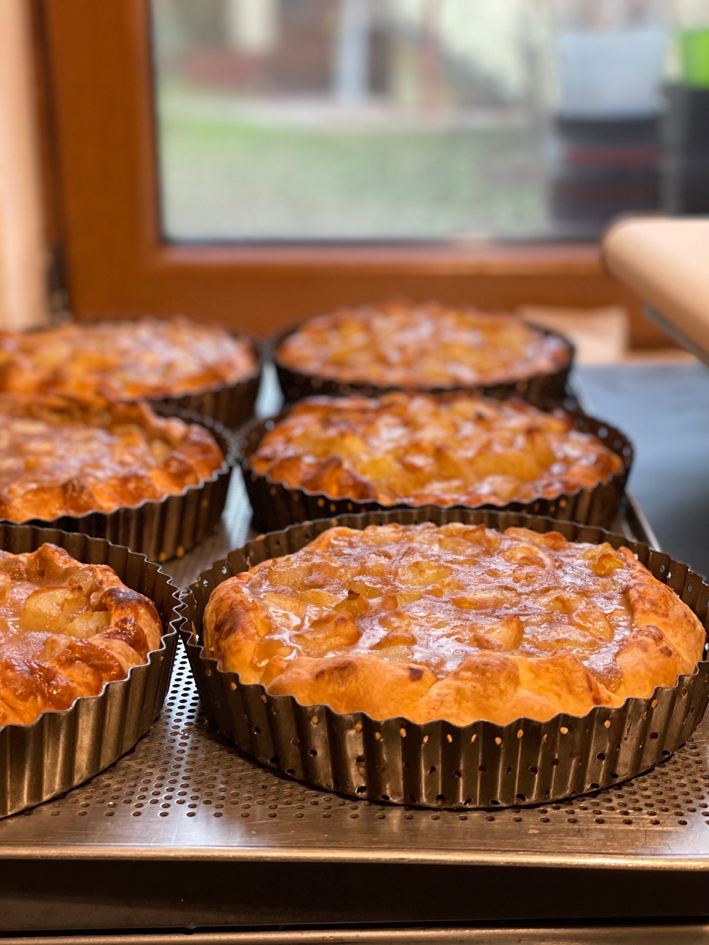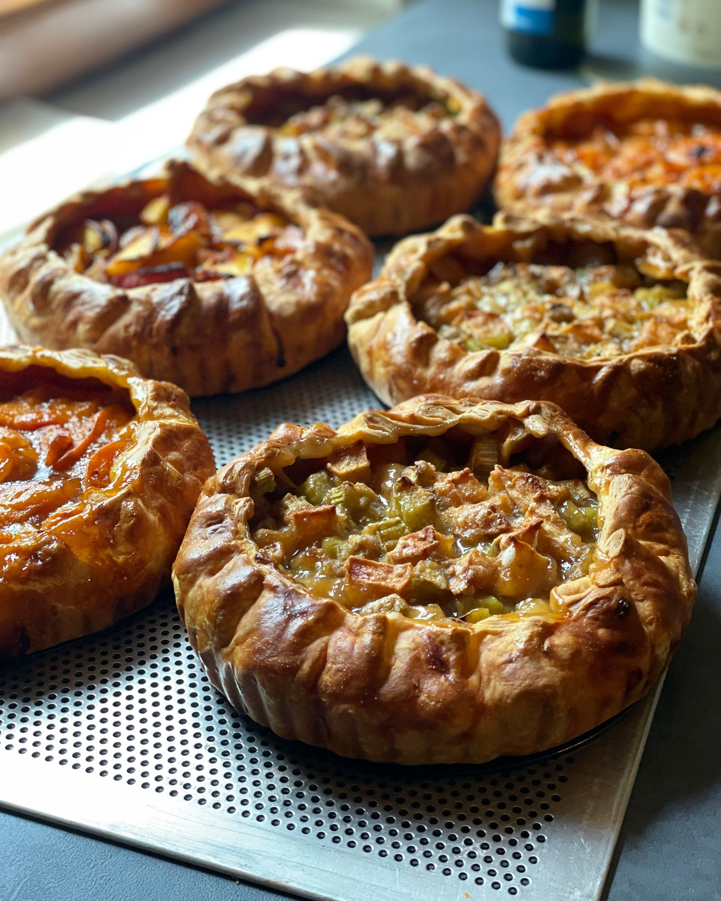 We add just a touch of brown sugar, starch, vanilla, and cinnamon, then bake them slowly until the crust turns golden and the fruit releases its sweetness and aroma into the crisp pastry.