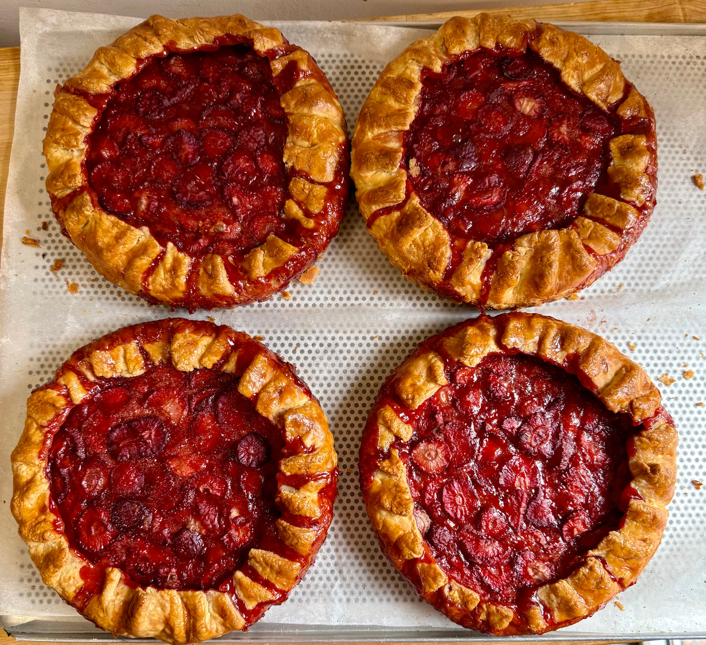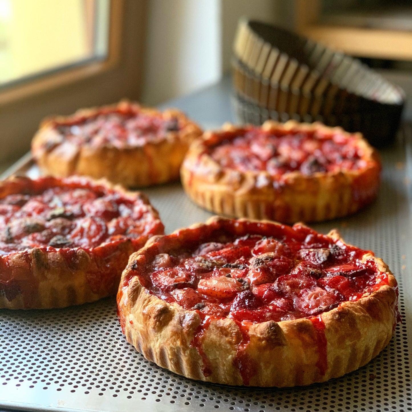 A rustic fruit tart — our crostatas are made with a tender pastry dough of flour, butter, and sour cream, then generously filled with ripe, seasonal fruit.